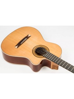 Cette guitare Alhambra est un modèle hybride électro-acoustique qui possède un manche fin et une caisse de type folk. Sa table est en cèdre massif, son dos et ses éclisses en sapelli massif. Son manche en acajou est légèrement galbé sur la touche en palissandre indien. La finition soignée présente un vernis naturel brillant et des mécaniques dorées. Ce modèle est équipé du système Fishman Classica M.